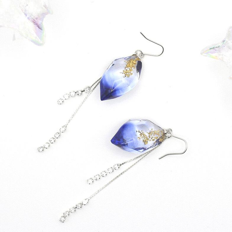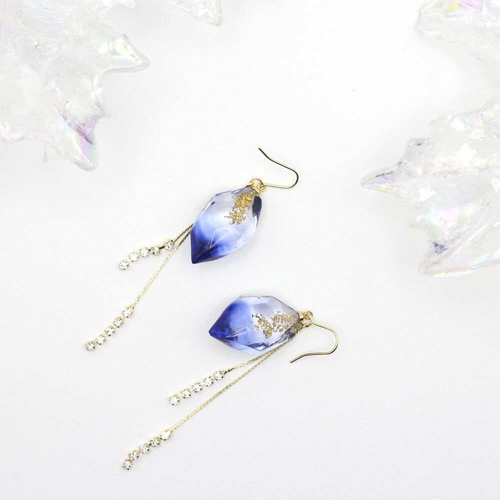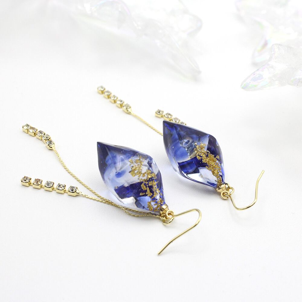 自然の力を感じさせるレジンの鉱石と、ラインストーンの輝きを組み合わせた艶やかなピアスです。